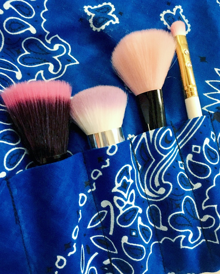 The cutest yet handiest makeup brush cases made from real bandanas. With 9 pockets of varying size, you can stash all your favorite brushes and eyeliners in one adorable case. Wraps up and fastens with a cute little button. The perfect travel accessory.